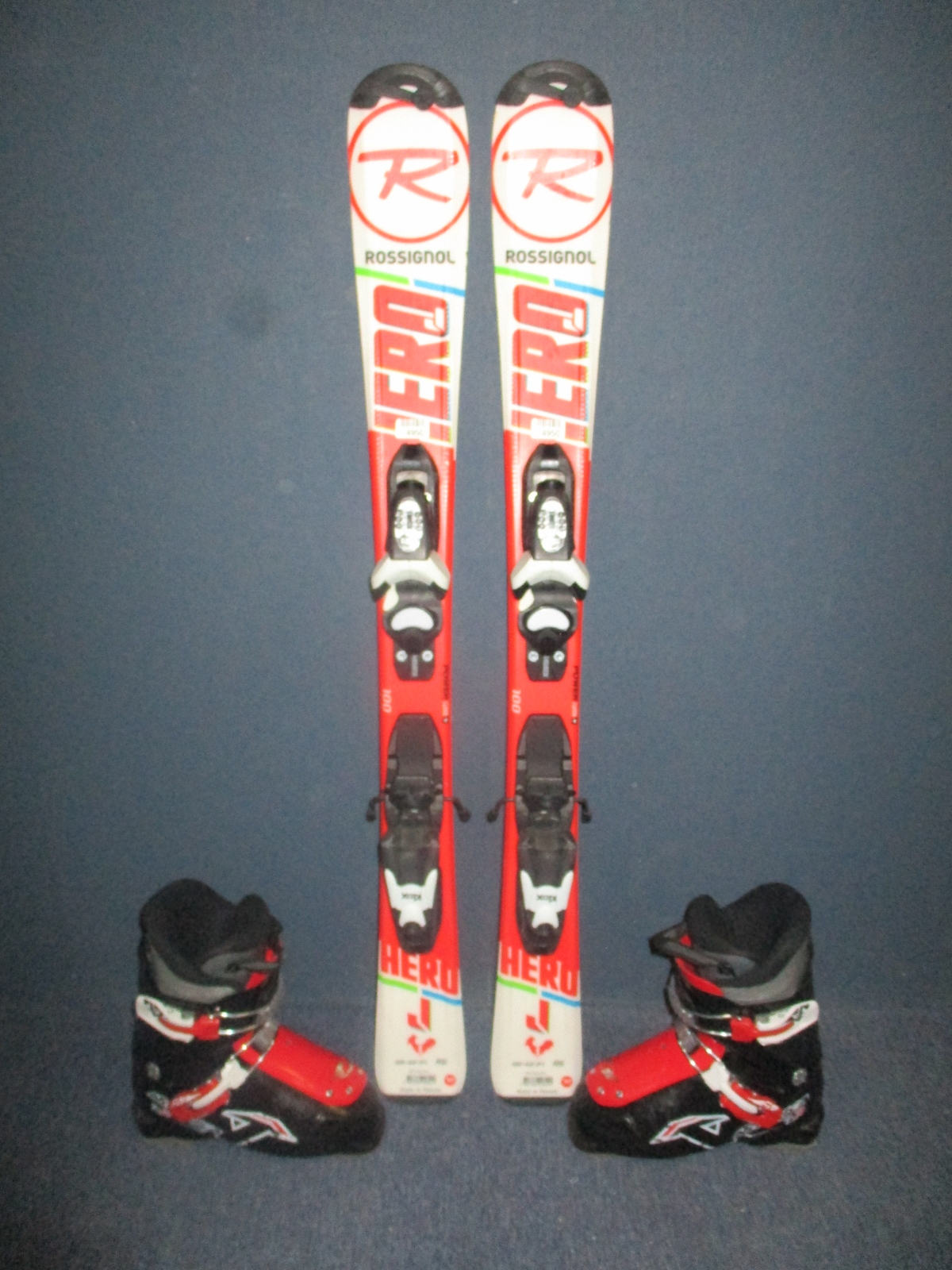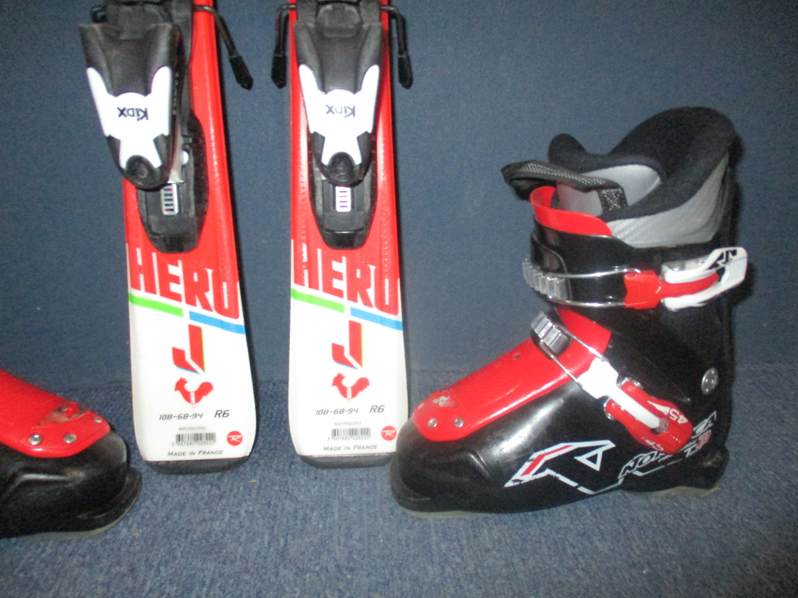 Cena je za komplet. Záruka 1 rok.10712. Dětské carvingové lyže ROSSIGNOL HERO 100cm, lyže jsou po servisu skluznic, radius 6m, krojení 107 - 68 - 94, kompozitové jádro + sklolaminát, konstrukce cap + lyžáky NORDICA FIREARROW TEAM 2 stélka 20,5cm, 2x přezka, flexindex 50. SUPER STAV