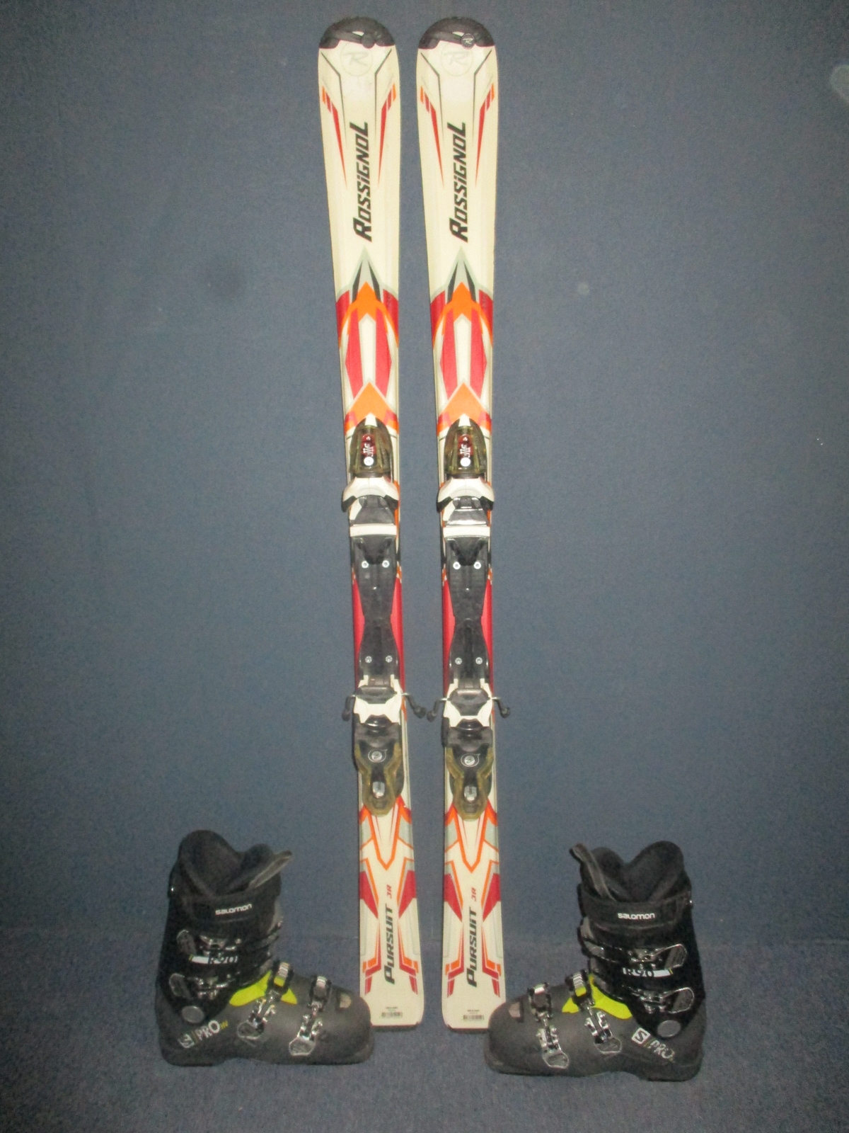 Cena je za komplet. Záruka 1 rok.10717. Juniorské carvingové lyže ROSSIGNOL PURSUIT Jr 140cm, lyže jsou po servisu skluznic, radius 12m, krojení 108 - 67 - 94, kompozitové jádro + sklolaminát, konstrukce cap + lyžáky SALOMON S/PRO HV R90 stélka 26,5cm, 4x mikro přezka, makro dotažení, flexindex 90, oversized pivot, VÝBORNÝ STAV