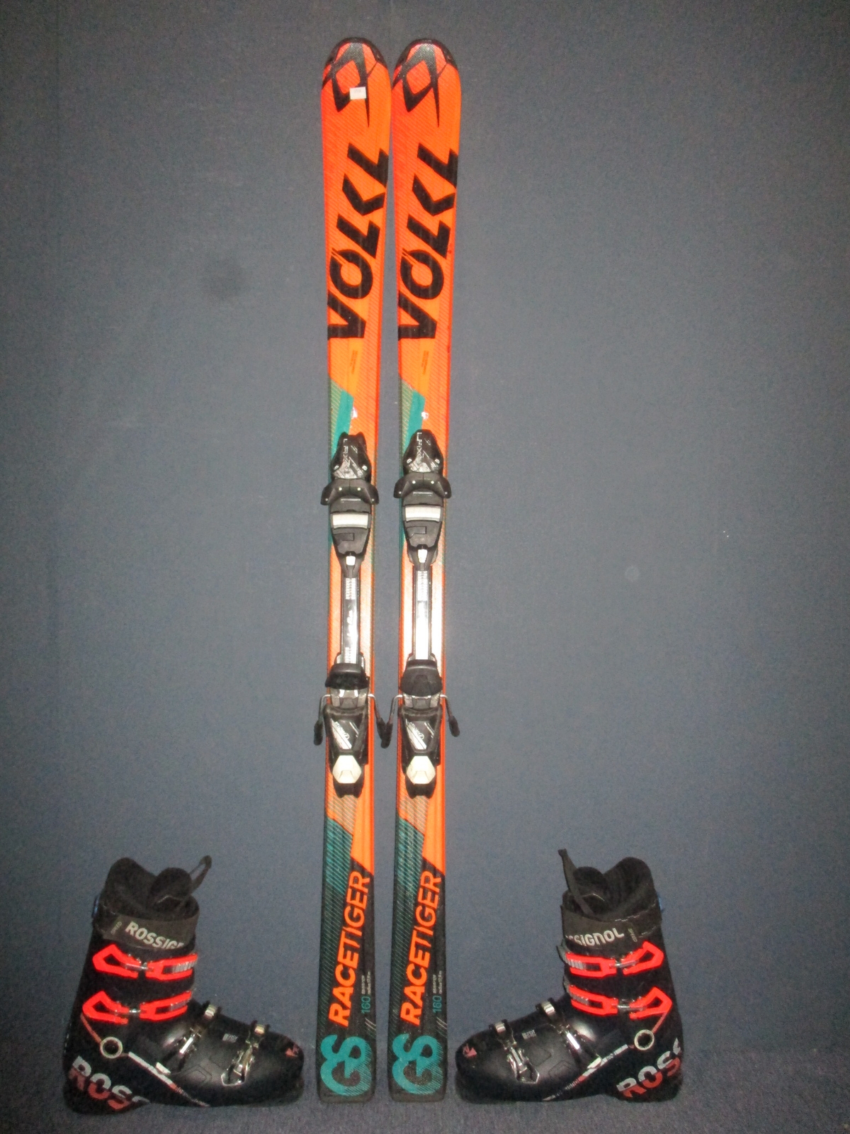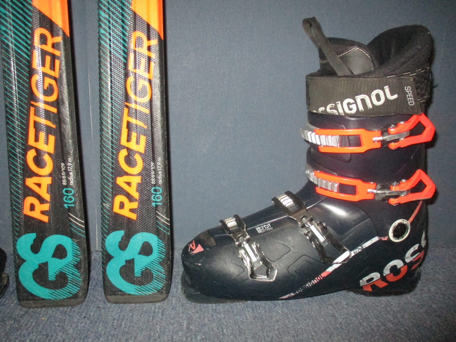 Cena je za komplet. Záruka 1 rok.10695. Juniorské carvingové lyže VÖLKL RACETIGER GS 160cm, lyže jsou po servisu skluznic, radius 17,9m, krojení 109 - 69 - 88, kompozitové + sklolaminát, konstrukce power, hadí povrch + lyžáky ROSSIGNOL ALLSPEED stélka 29cm, 4x mikro přezka, makro dotažení, canting, flexindex 80, VÝBORNÝ STAV